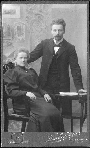 Henkilöt: Ruusu Merikallio (Da), Otto Merikallio (D). Aika: 1908. Paikka: Vaasa. Kuvaaja: Karls Atelier, Vaasa. |