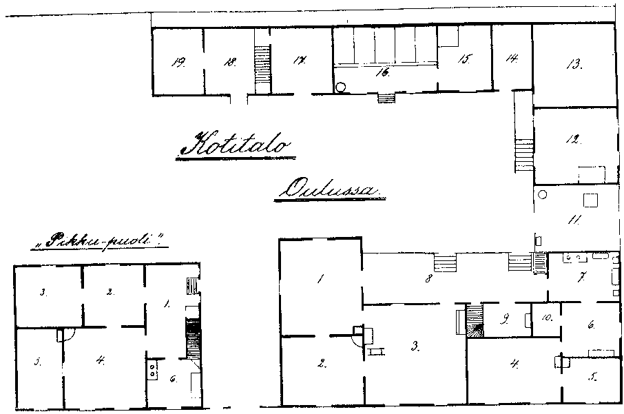 Oulun kotitalo, Kajaaninkatu 9, joka paloi maan tasalle 1880. Päärakennus: 1: Isän työhuone, 2: makuukamari, 3: sali,